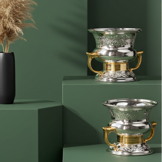 - الصقل: الطبقة الفضية المستخدمة ذات جودة عالية، مما يضمن قوة استثنائية ولمعانًا يدوم طويلاً. تم تصنيع اللمسات النهائية الذهبية باستخدام التذهيب الفاخر، وتظهر التفاصيل الدقيقة العناية التي تم اتخاذها في كل مرحلة من مراحل تصنيعها.