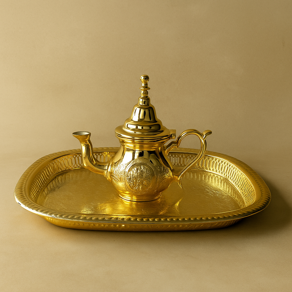 Le Plateau "Gourmet" (Taille S) : Le plateau "Gourmet" est le plateau parfait pour votre théière. Ses motifs martelés reprennent les codes de l'artisanat marocain et sa forme élégante met en valeur la beauté de la théière "Chaï". Plus qu'un simple support, il est une invitation à présenter vos thés et vos douceurs avec grâce.