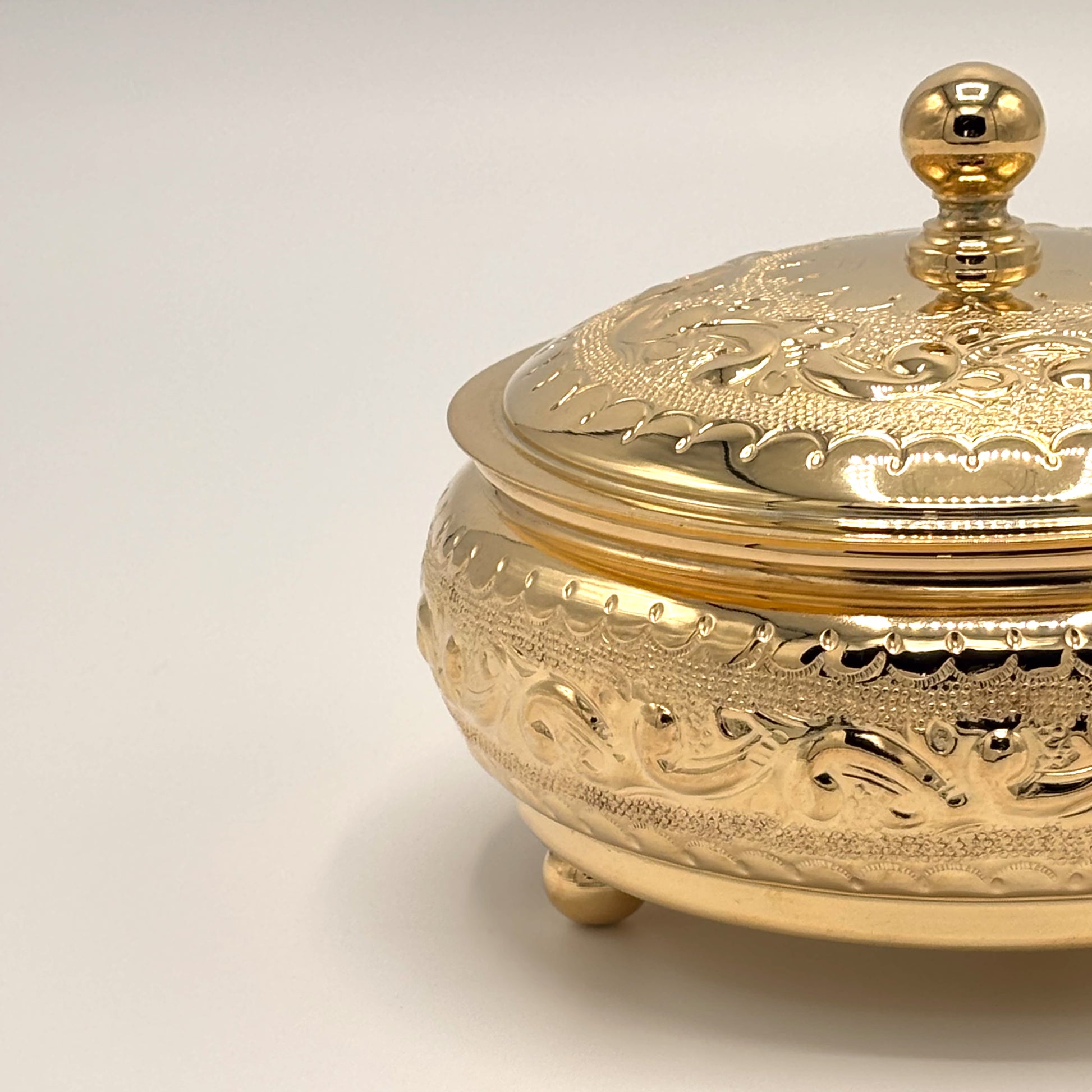 Avec ses pieds délicats, ses reliefs sculptés à la main et son couvercle orné d’un bouton perlé, Bliss incarne un style noble et raffiné. Ses motifs ciselés à la main rappellent les ornements traditionnels marocains, tout en apportant une touche résolument élégante et décorative. Sur un plateau à thé ou posé seul comme pièce centrale, il attire immédiatement le regard.