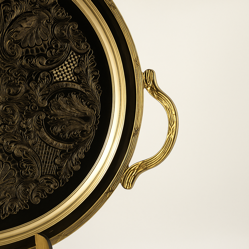 Alliez art de recevoir et élégance intemporelle avec Mignardises, un plateau marocain d’exception, pensé pour sublimer vos instants gourmands. Façonné à la main puis plongé dans un bain de cyanure d’or 24 carats, ce plateau se distingue par son éclat doré somptueux et son centre noir intensément décoratif, orné de gravures fines réalisées à la main.