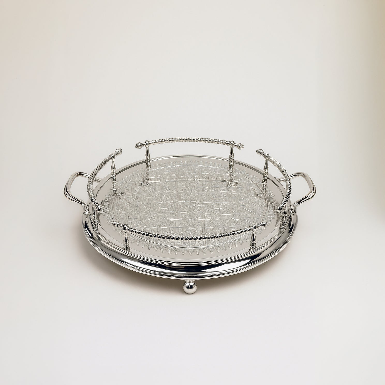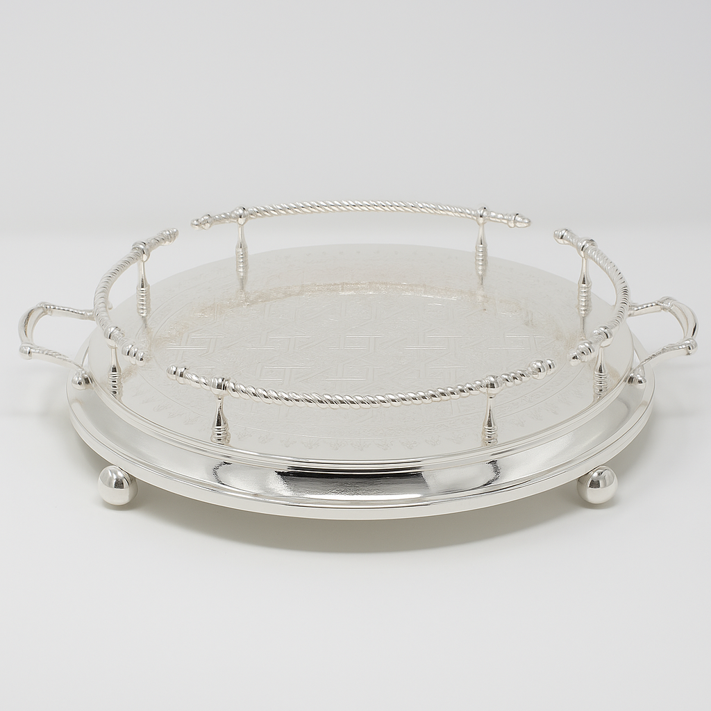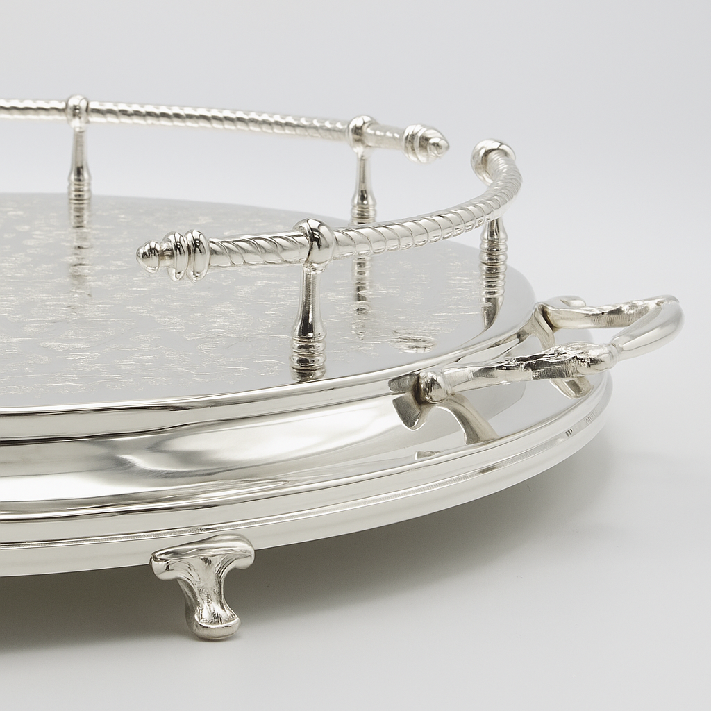 - Matériau : Conçu en laiton et couvert d'une fine pellicule d'argent, ce plateau garantit une durabilité exceptionnelle et une brillance intemporelle, symbole de luxe et de qualité.