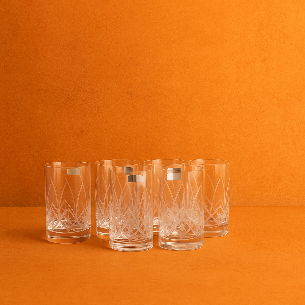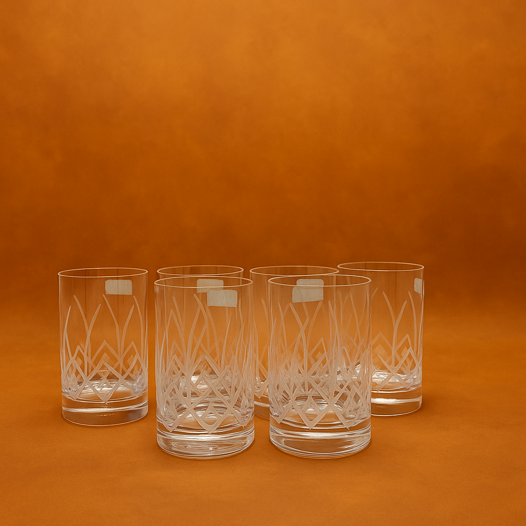 Fabriqués avec soin, ces verres "Taghazout" se distinguent par leur beauté et leur durabilité. Leurs motifs géométriques gravés offrent une note d'élégance unique à votre table, que ce soit pour un dîner entre amis ou une soirée en famille.