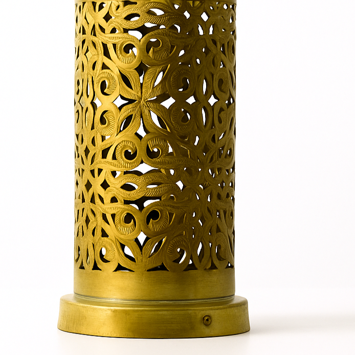 Apportez une touche céleste à votre intérieur avec "Elysian", une lampe de table en laiton ajourée en forme de tour élancée. Inspirée des motifs cosmiques et des arts traditionnels marocains, cette pièce unique a été conçue à la main par des artisans de Fès pour diffuser une lumière douce et envoûtante.